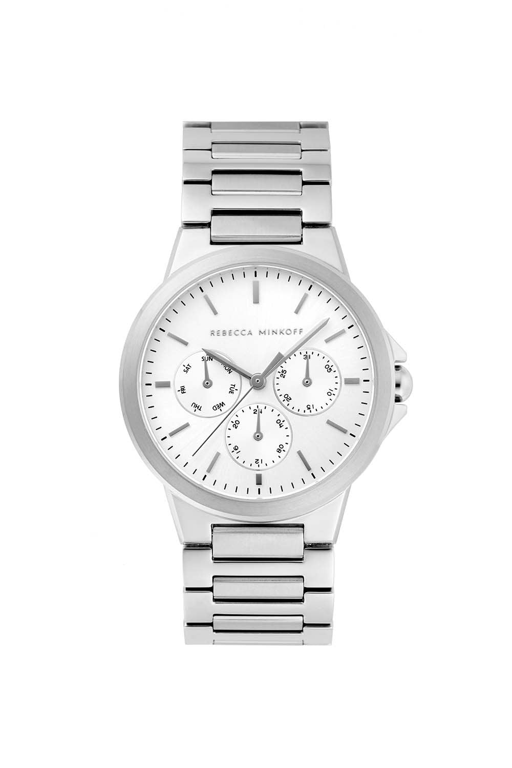 Inspired by a masculine silhouette, the Rebecca Minkoff Cali watch's elevated style and elegant design complement its stainless steel bracelet and striking 36mm round case. A clean-edge silver white sunray chronograph dial features applied stick markers and 3-hand movement complete with minute trackers - because timing's everything.