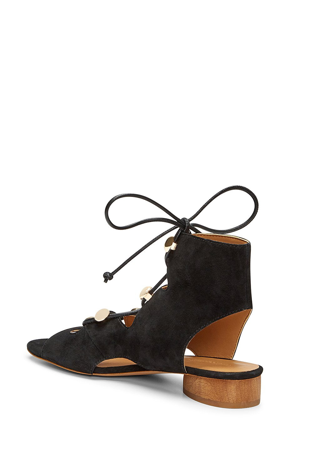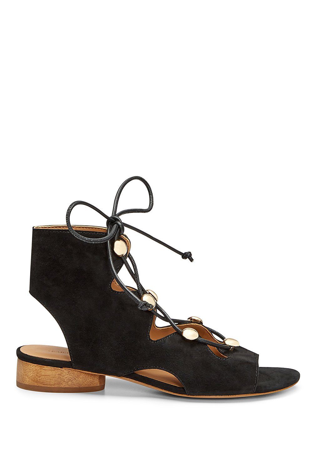 Good strings attached. Our suede Kyla Sandal features an open toe, a wooden cylinder heel and laced statement hardware.