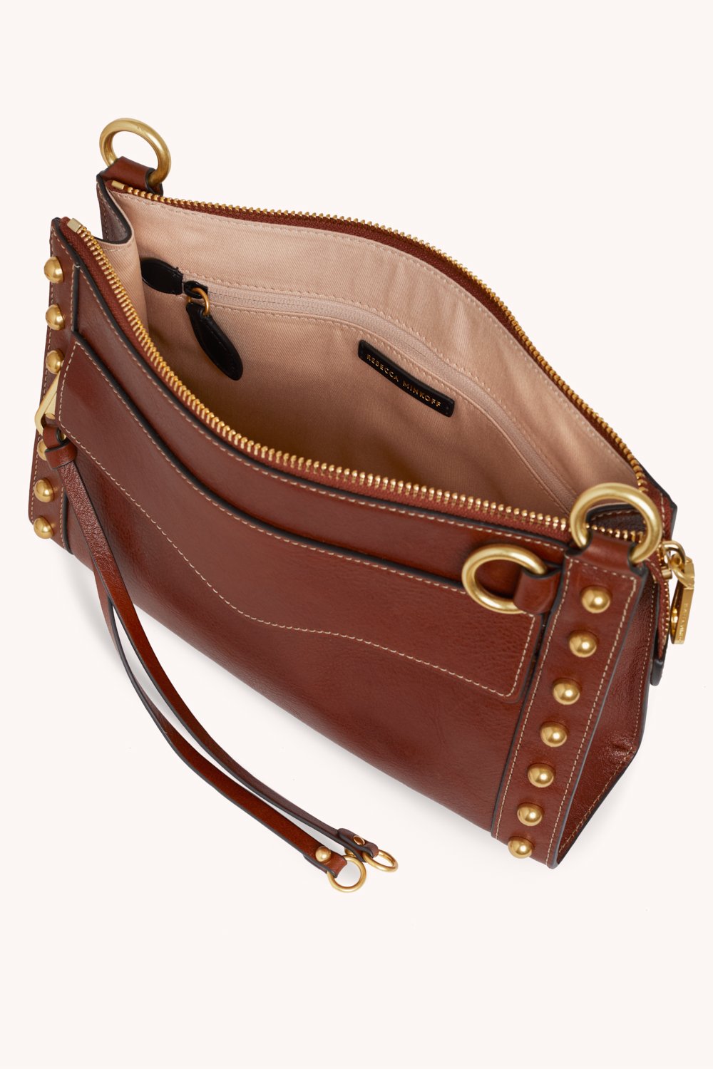 Rebecca's latest iteration of the iconic M.A.B Crossbody, the M.A.B. Crossbody with Studs in dark luggage brown, is carefully crafted from buttery soft lambskin and finished with silver hardware and accents. This new style is slightly larger than the OG and features edgy statement studs and an adjustable chain crossbody strap. The M.A.B. Crossbody with Studs in dark luggage is sure to become your new favorite purse.