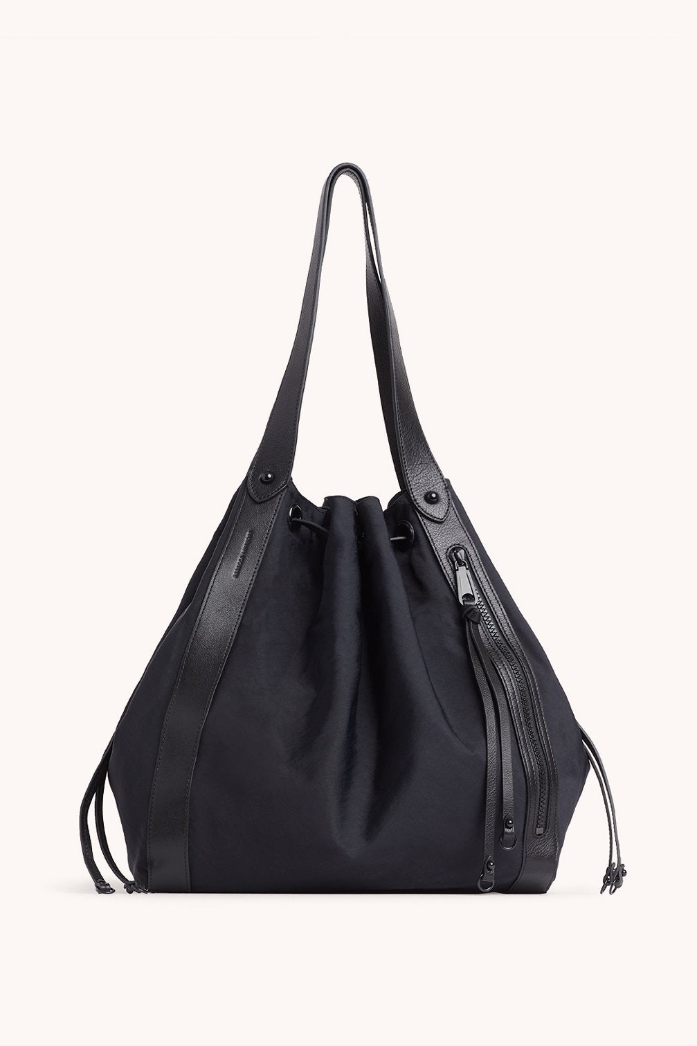 If you're looking for the perfect puffy tote bag that can keep up with your busy schedule and go seamlessly from day to night, our new M.A.B. Nylon Tote in black is for you! Adding a modern silhouette to OG Collection, the M.A.B. Nylon Tote bag in black is crafted from durable washed nylon with leather trim featuring black hardware accents, lots of interior space, a drawstring top closure and exterior zipper for easy access.