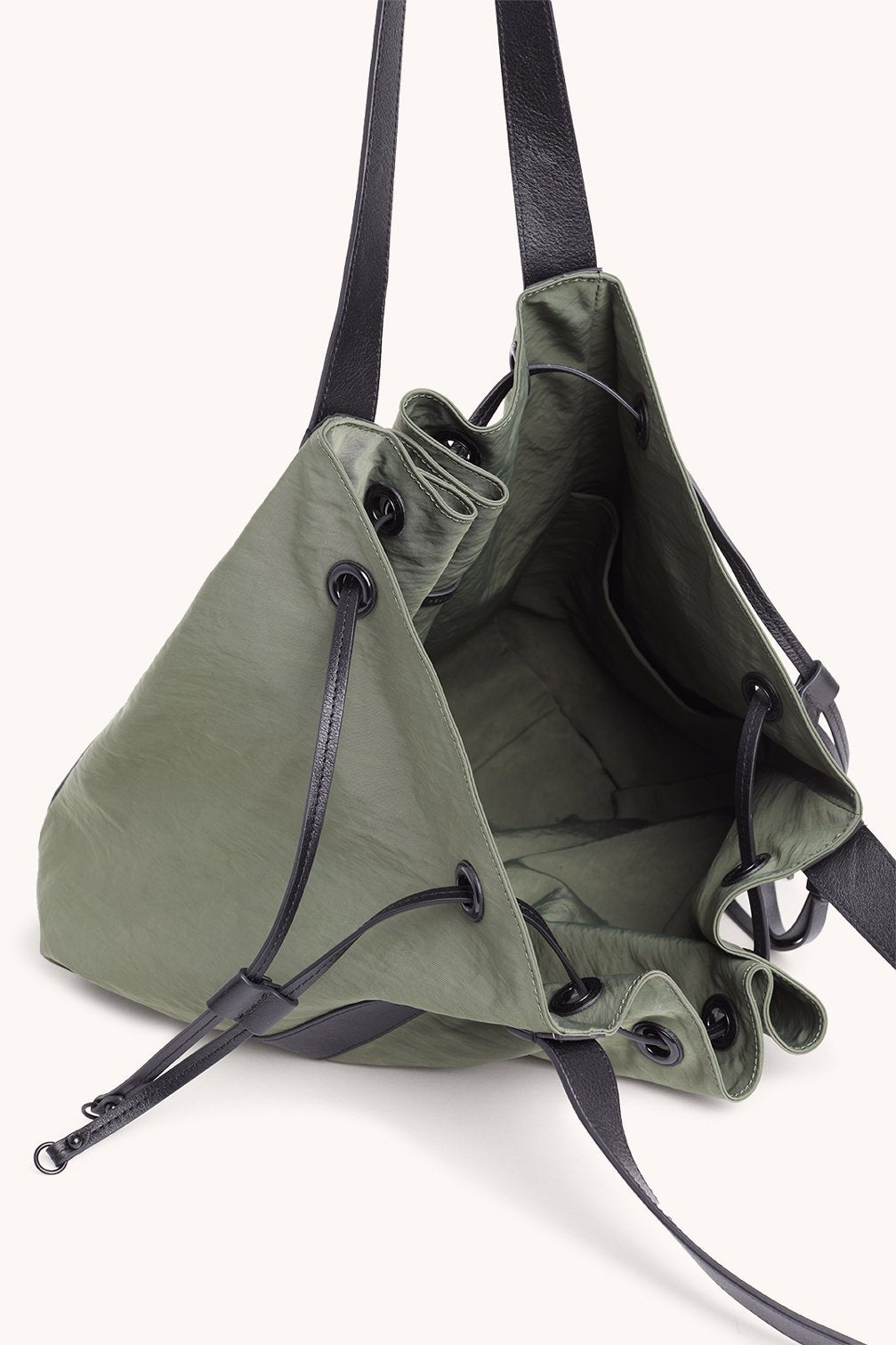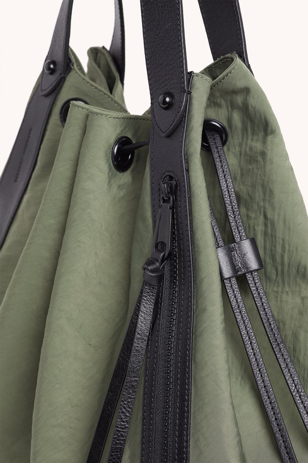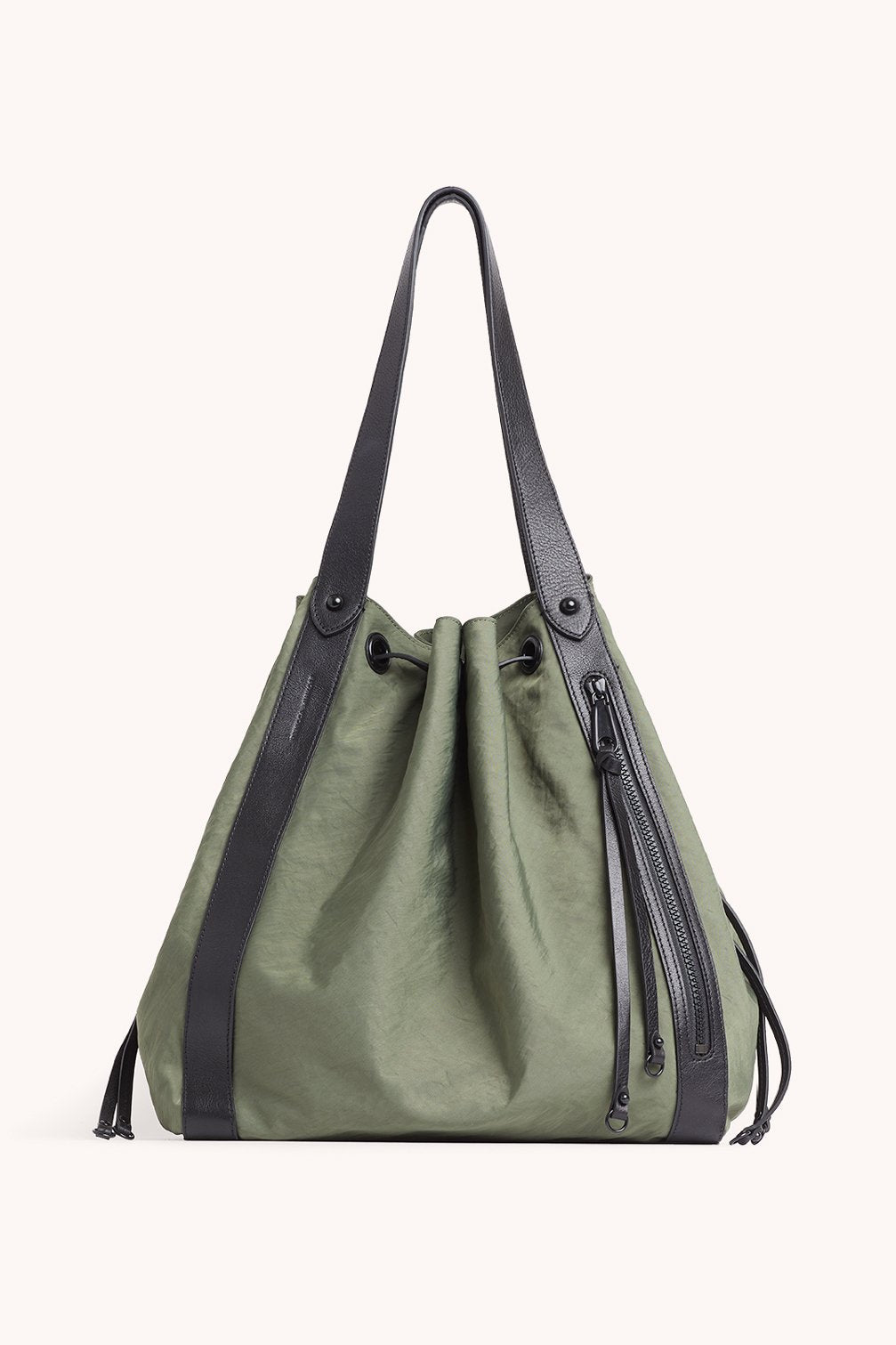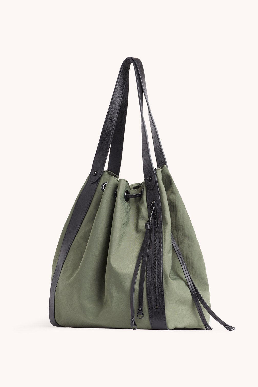 Looking for a chic nylon tote bag that's durable and can keep up with your busy schedule? The new M.A.B. Nylon Tote in olive and black is for you! The M.A.B. Nylon Tote is carefully crafted from olive green washed nylon featuring black leather trim, black hardware accents, lots of interior space, a black drawstring top closure and exterior zipper for easy access. This puffy nylon tote is the perfect companion for all your activities.