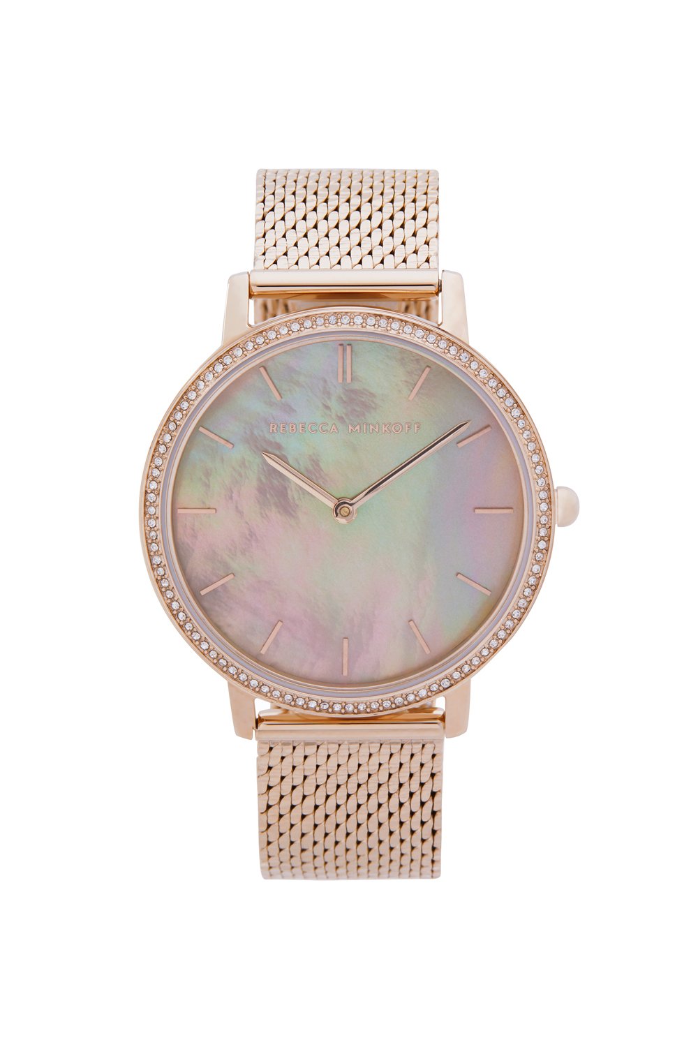 Dazzling micro-pave diamonds shower the round case of this Rebecca Minkoff watch. This style is on the cutting-edge of design with the latest pressed mesh technique featured on the carnation gold dipped bracelet.