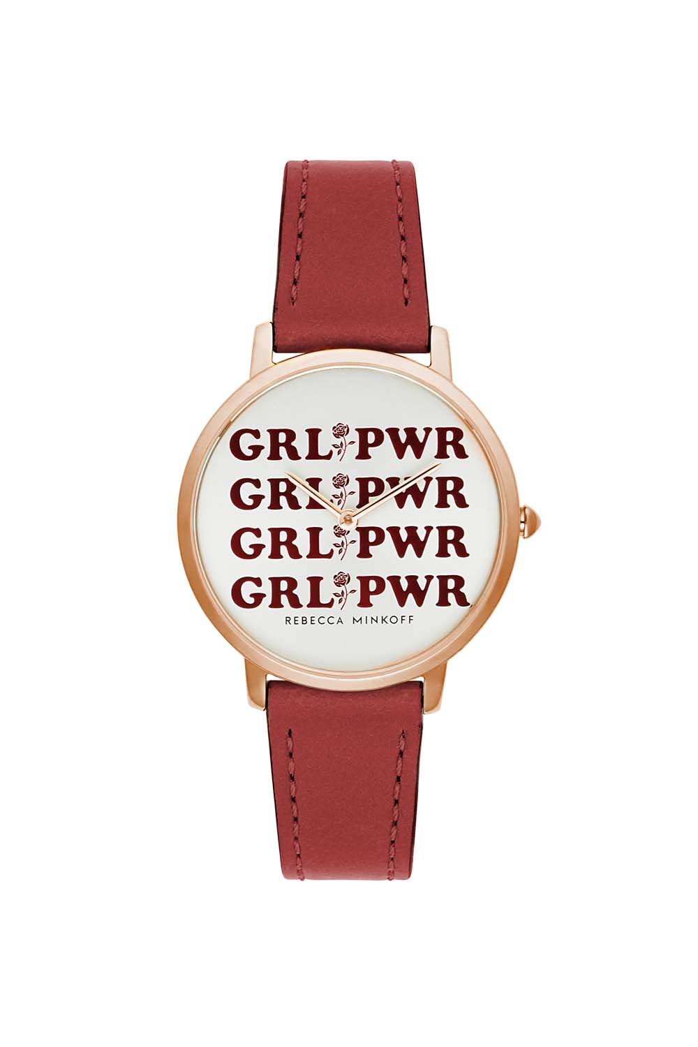 The distinctive round, slim case of our Major collection combines classic wristwatch style with signature Rebecca Minkoff embellishments. Its 35mm rose gold case features a red leather strap and two-hand movement, perfectly positioned atop a silver white sunray dial and inscribed with your new mantra.