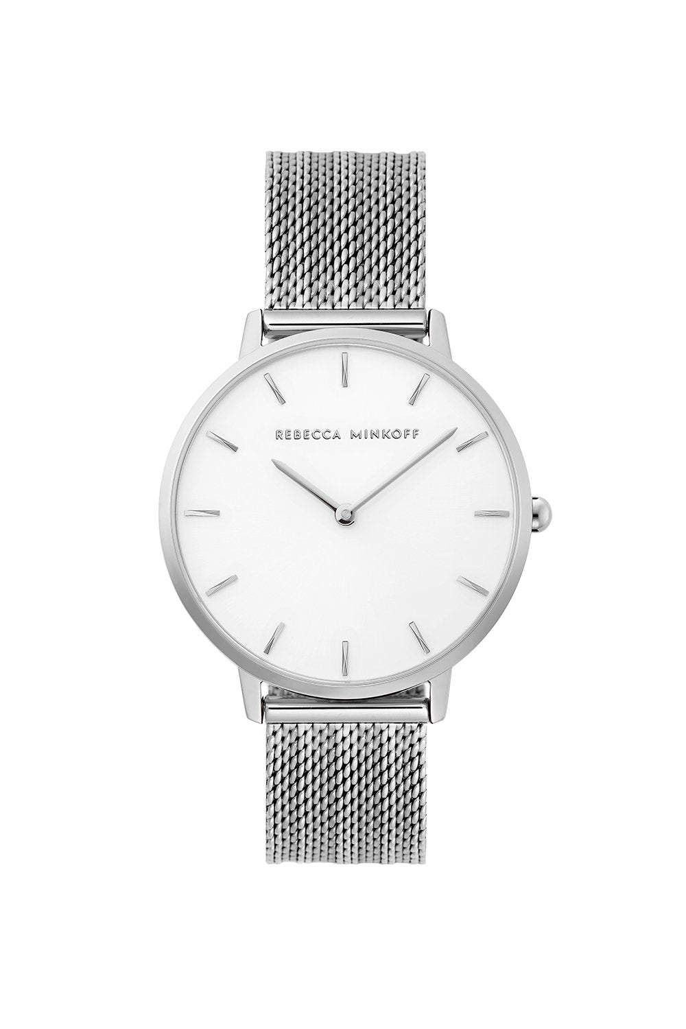 Rebecca Minkoff's wide-face Major watch in 35mm silver white sunray dial pairs with a stainless steel mesh bracelet for an overall modern glam effect that's perfect in any occasion.