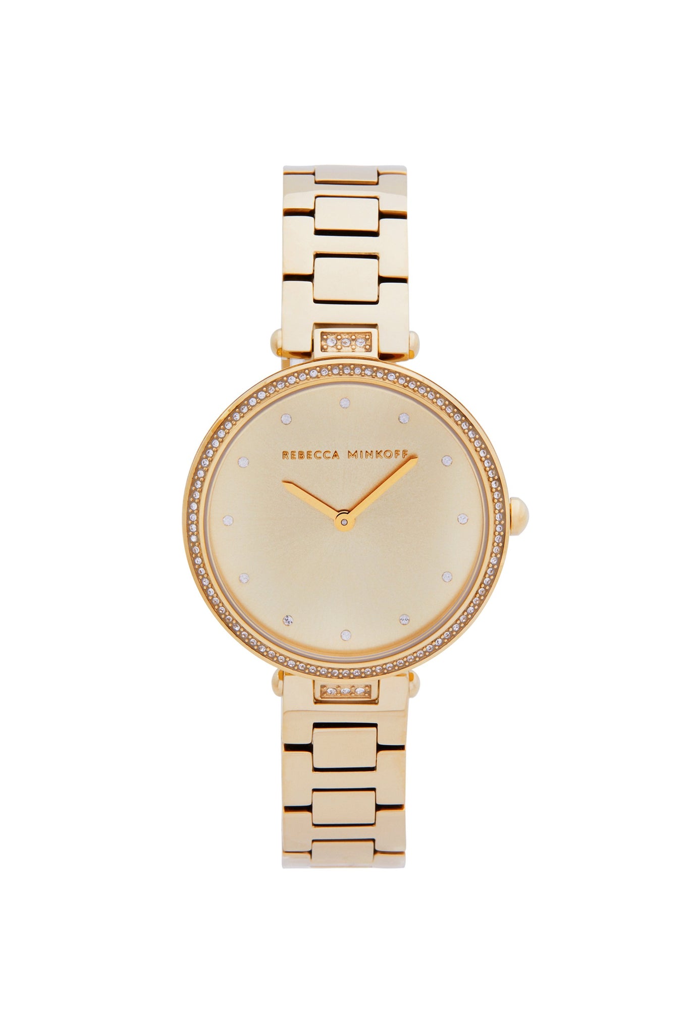 Designed with femininity in mind, the Rebecca Minkoff Nina watch is made from a 33mm stainless steel case that is surrounded by delicate micro pave diamonds.