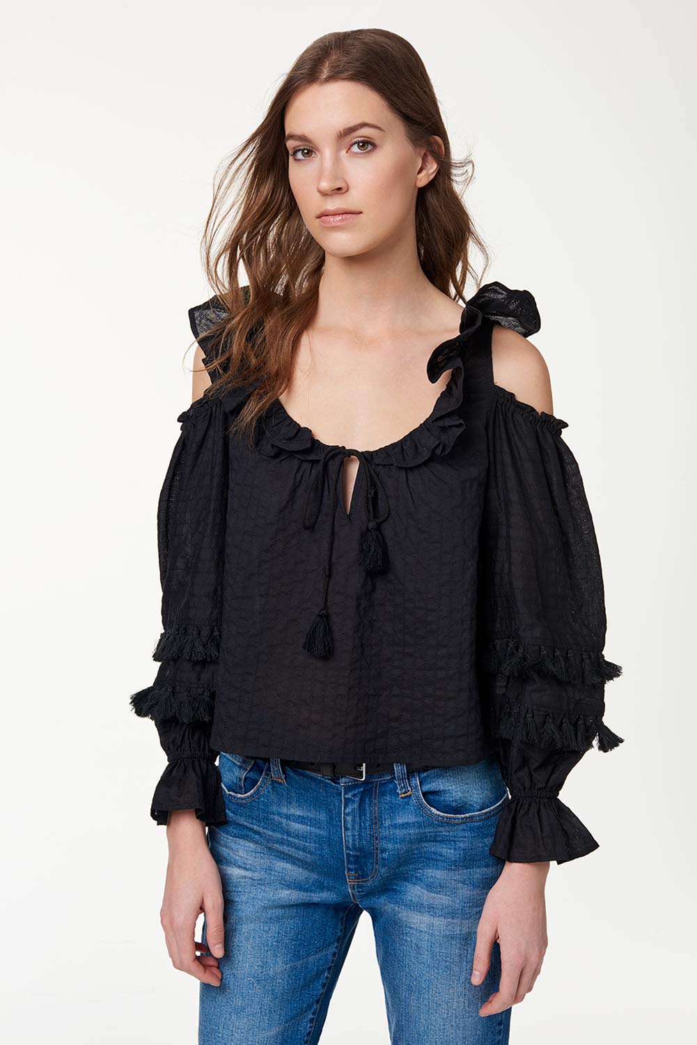 All tied up. Our Pippa Top comes in tonal striping with tassel ties at the neck and down the sleeves. Gathered sleeves and exposed shoulders should keep you pretty busy.